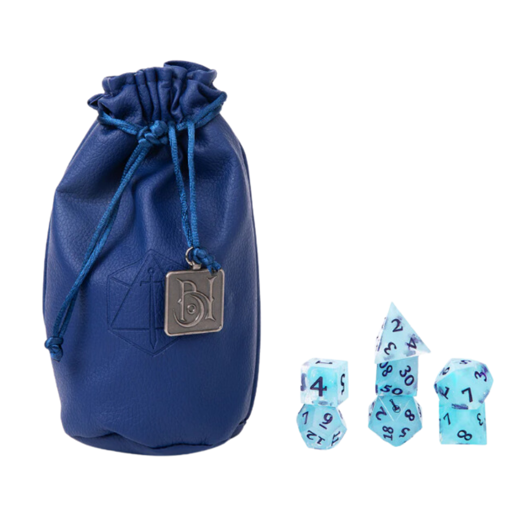 - Dice set arrives in a blue synthetic (polyurethane) leather bag with a debossed Critical Role logo, drawstrings, and orange nylon lining.