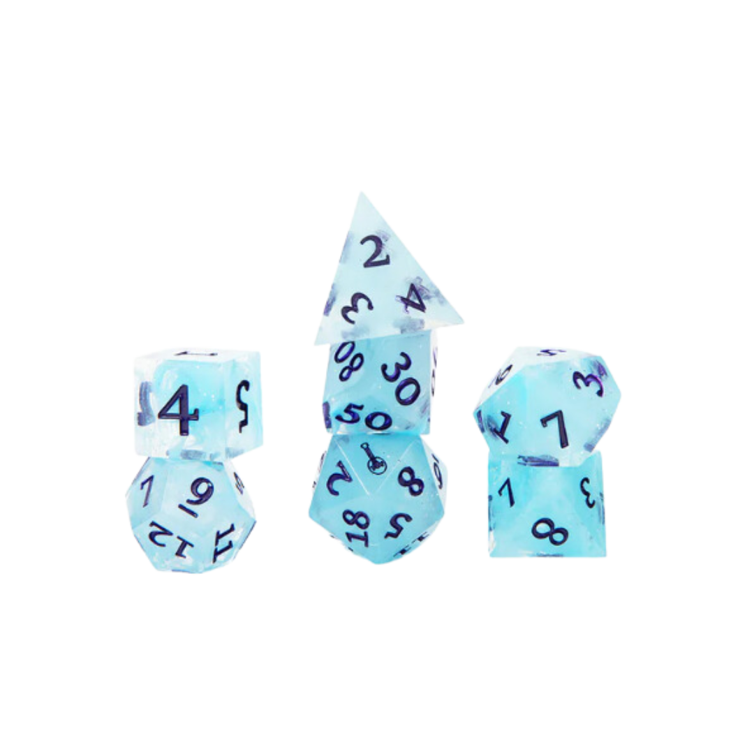 Prepare your roll to meet fairer winds! Inspired by the captivating Dorian Storm, this beautiful sharp-edged dice set is translucent with blue swirl and silver shimmer inside, navy blue numbering, and a lute icon on the 20-side of the d20 die.