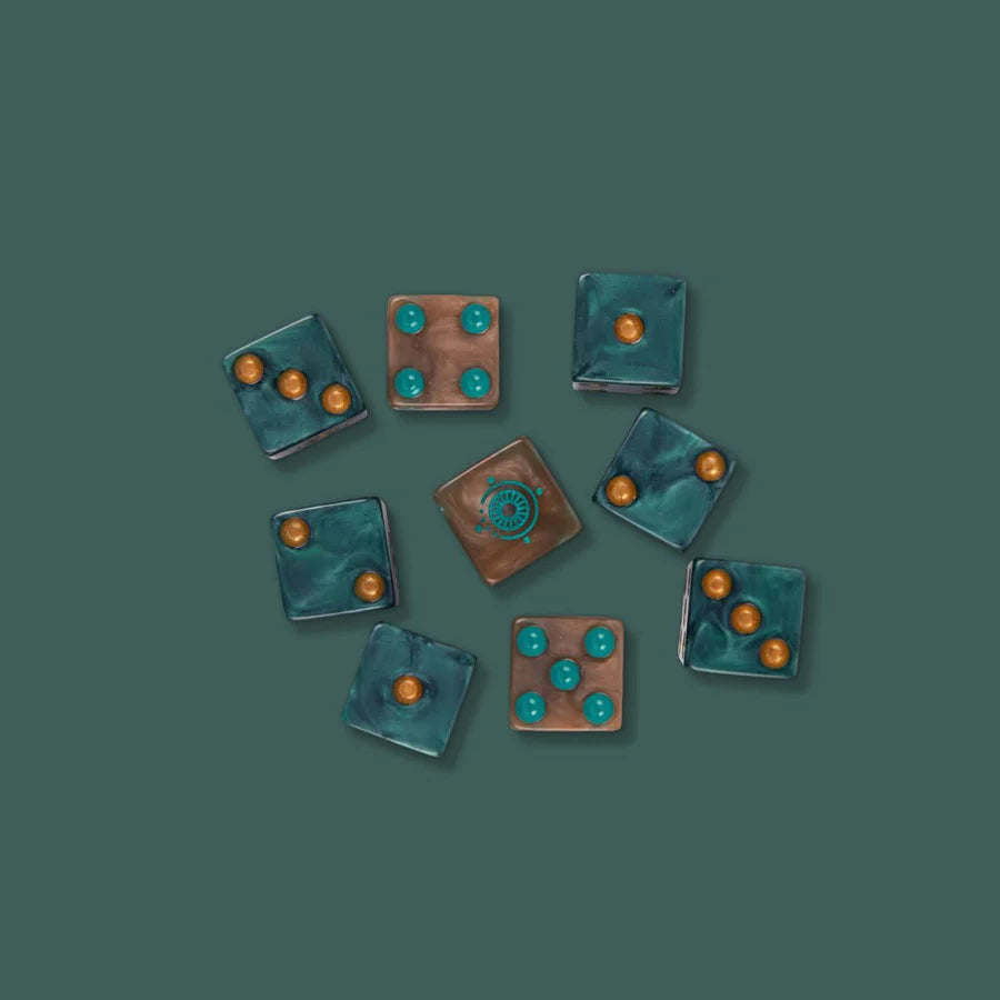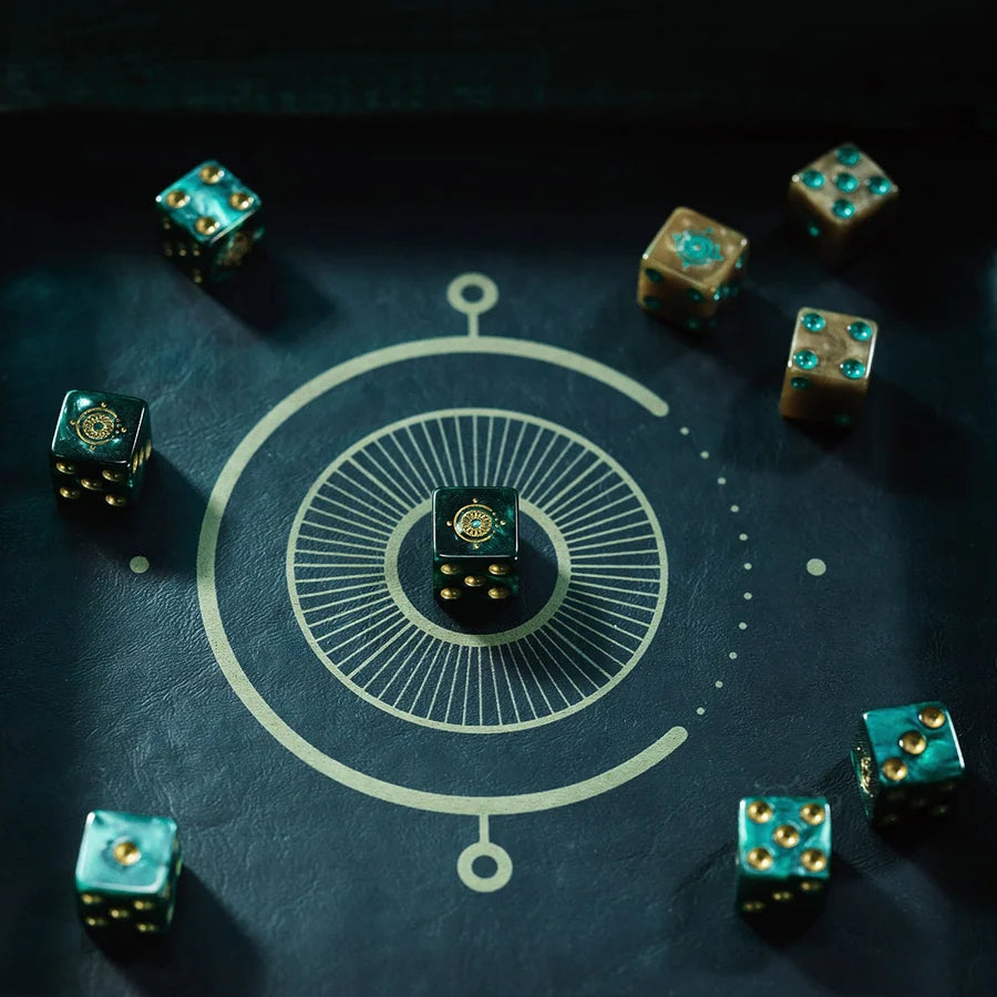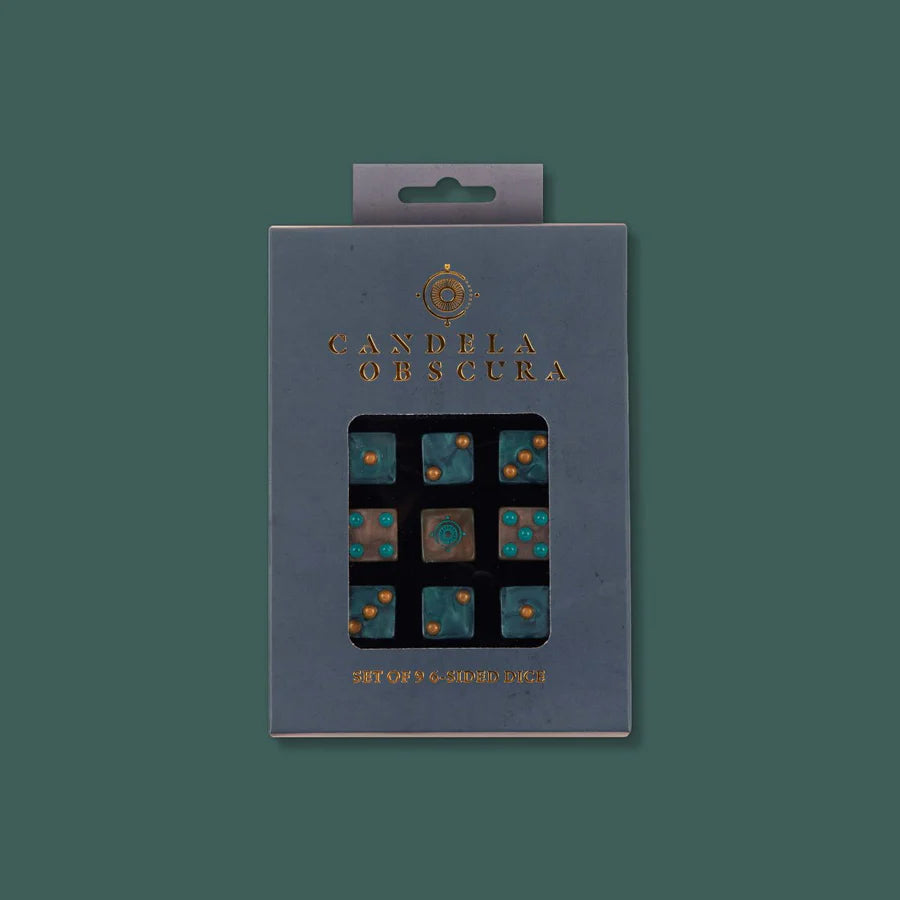 Battle terrors from beyond the Flare with this set of nine 6-sided Candela Obscura dice specifically created for your adventures through the Fairelands. With the 6-side of every die engraved with the official logo, this beautiful dice set includes 6 pearlescent green dice with metallic gold pips and 3 gold “gilded dice” with teal pips, housed in a molded plastic tray and custom box.