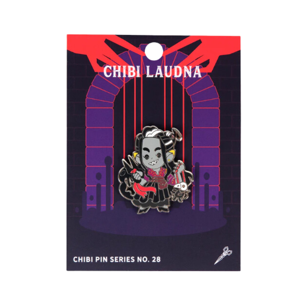 Add some shadow magic to your duds with this sorcerous Laudna pin, showing off the signature white-streaked dark hair, red blouse, and wide grin that stops onlookers dead in their tracks. And don’t forget her rat-raven puppet Pâté de Rolo by her side!