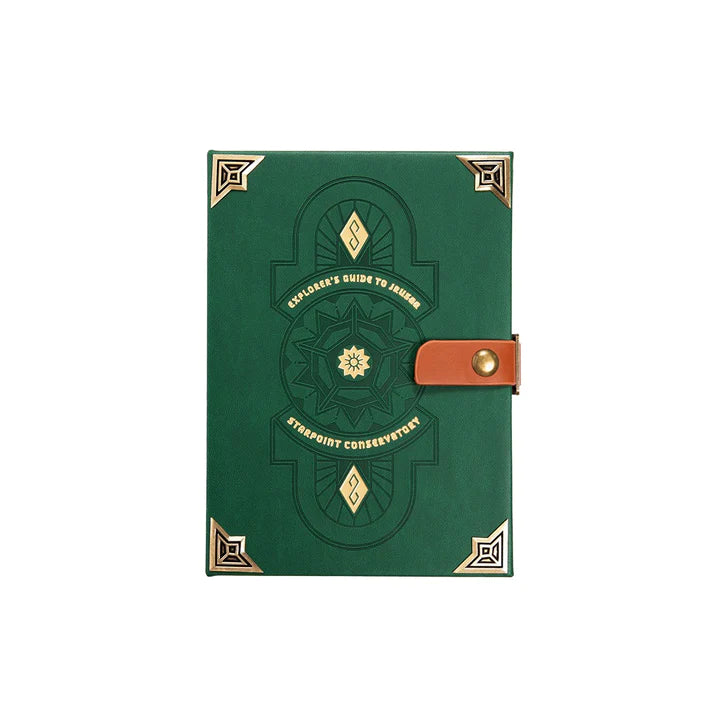 Disguised as a book—Explorer’s Guide to Jrusar from the Starpoint Conservatory—the Critical Role Dice Tome Rolling Tray is wrapped in dark green faux leather and detailed with antique debossed metal in gold. Crack open this tome to reveal your dice, ready for Rollies on the felt-lined full rolling tray on the left, while the right side is divided for rolling and storage of accessories and minis.