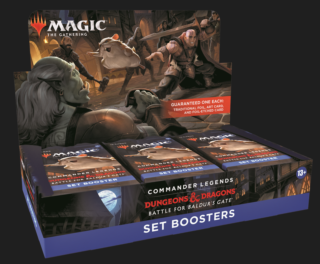 Commander Legends meets D&D in this exciting crossover set! The Commander Legends: Battle for Baldur’s Gate Set Booster Box contains 18 Commander Legends: Battle for Baldur’s Gate Set Boosters. Each Set Booster contains 15 Magic cards, 1 Art Card, and 1 token, ad card, or card from “The List” (a special card from Magic's history—found in 25% of packs).