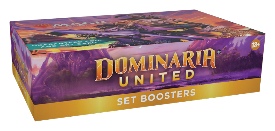The Dominaria United Set Booster Box contains 30 Dominaria United Set Boosters and 1 Traditional Foil Box Topper card.