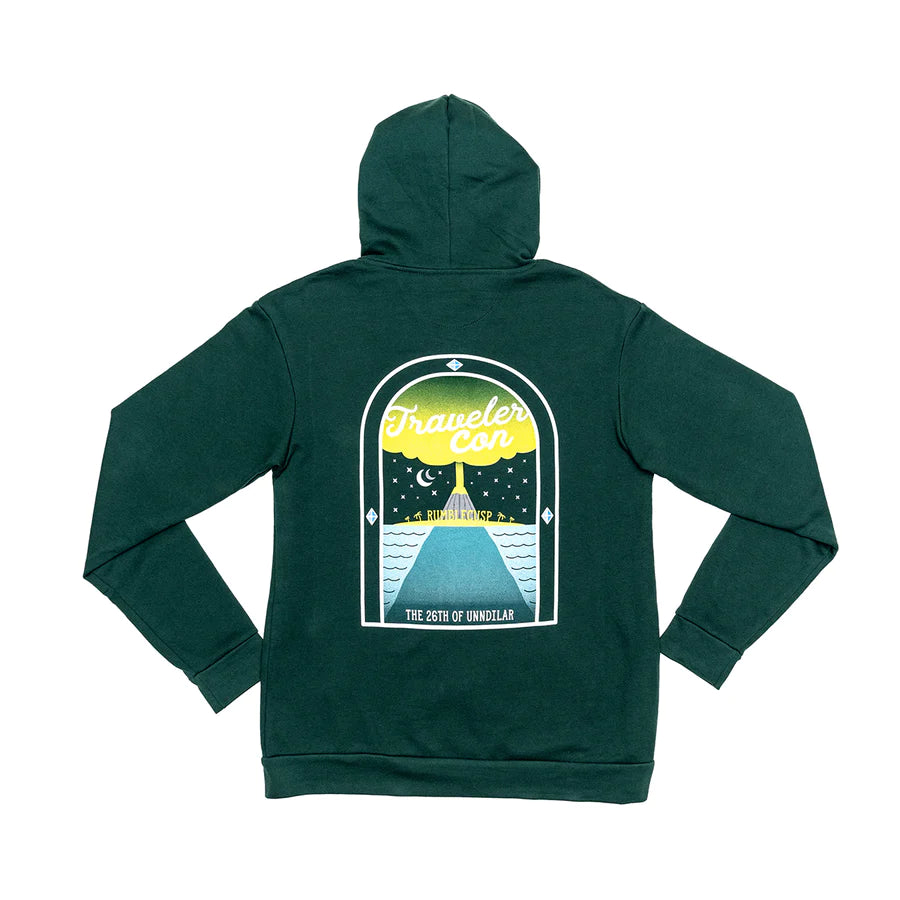Have you heard of the Traveler? Pack your bags for Rumblecusp and join the Traveler Con festivities with this ultra-comfortable forest green fleece hoodie.